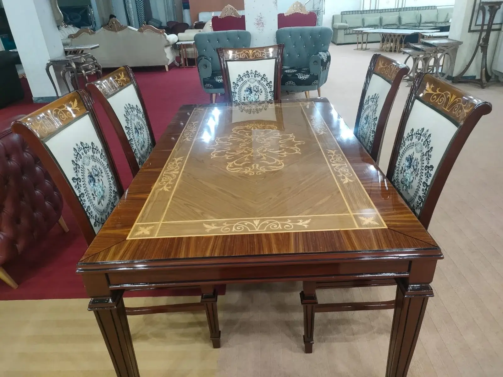 - ✓ Upper crown hand-carved dining chairs and table.
